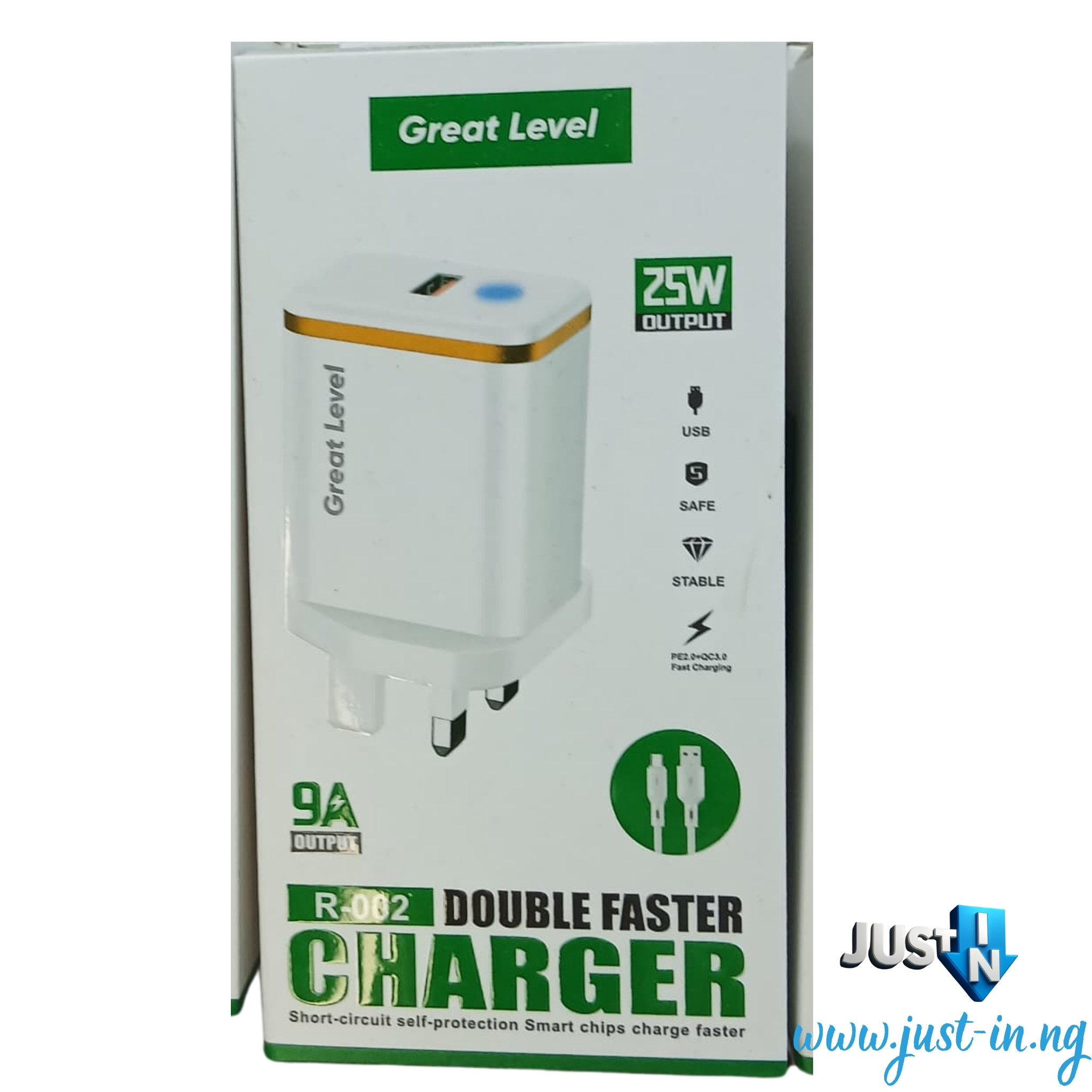 Buy Great Level R-002 25W USB dual fast charger. Compact, smart, safe & travel-ready. Adaptive fast charging for Android & iPhones. Available on Jumia & Konga.
