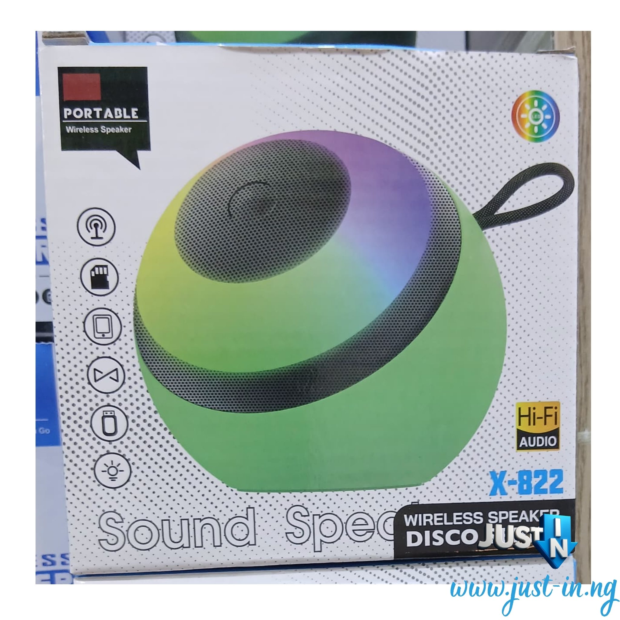 X-822 Portable Bluetooth Speaker with LED Disco Lights, USB/TF playback, and wireless streaming. Great sound and visual effects for parties.